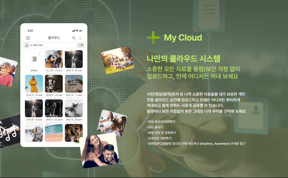 사진/영상/음악/문서 등 나의 소중한 자료들을 내가 보유한 개인 전용 클라우드 공간에 업로드하고 언제 어디서든 편리하게 꺼내 보고 쉽게 원하는 사람과 공유할 수 있습니다. 용량이나 보안 걱정없이 원본 그대로 나의 추억을 간직해 보세요.