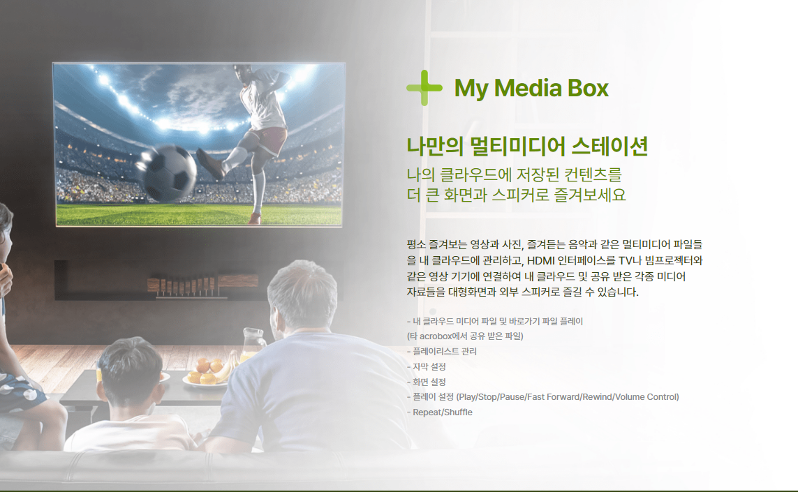 평소 즐겨보는 영상과 사진, 즐겨듣는 음악과 같은 멀티미디어 파일들을 내 클라우드에 관리하고, HDMI 인터페이스를 TV나 빔프로젝터와 같은 영상 기기에 연결하여 내 클라우드 및 공유 받은 각종 미디어들을 대형화면과 외부 스피커로 즐길 수 있습니다.