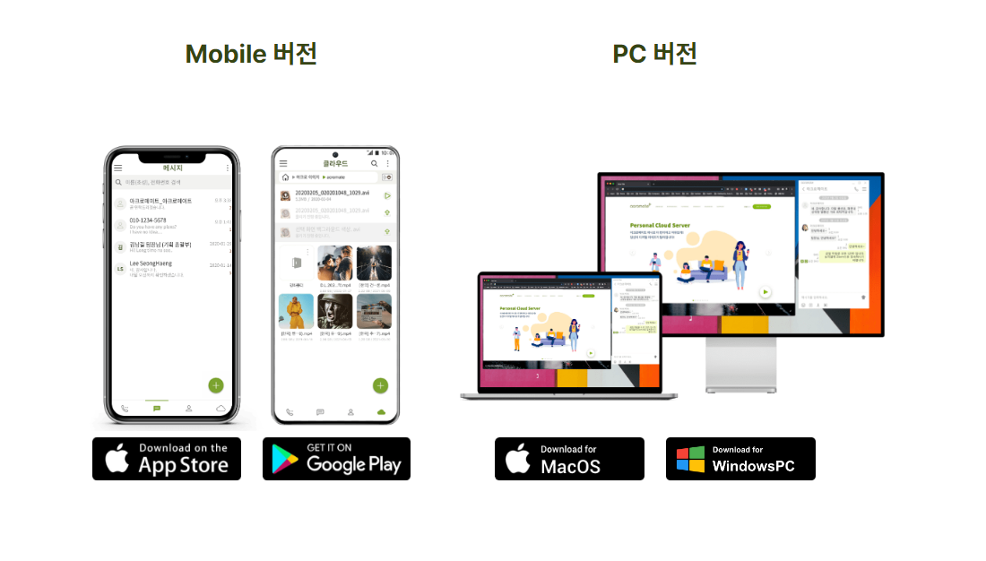 사진/영상/음악/문서 등 나의 소중한 자료들을 내가 보유한 개인 전용 클라우드 공간에 업로드하고 언제 어디서든 편리하게 꺼내 보고 쉽게 원하는 사람과 공유할 수 있습니다. 용량이나 보안 걱정없이 원본 그대로 나의 추억을 간직해 보세요.